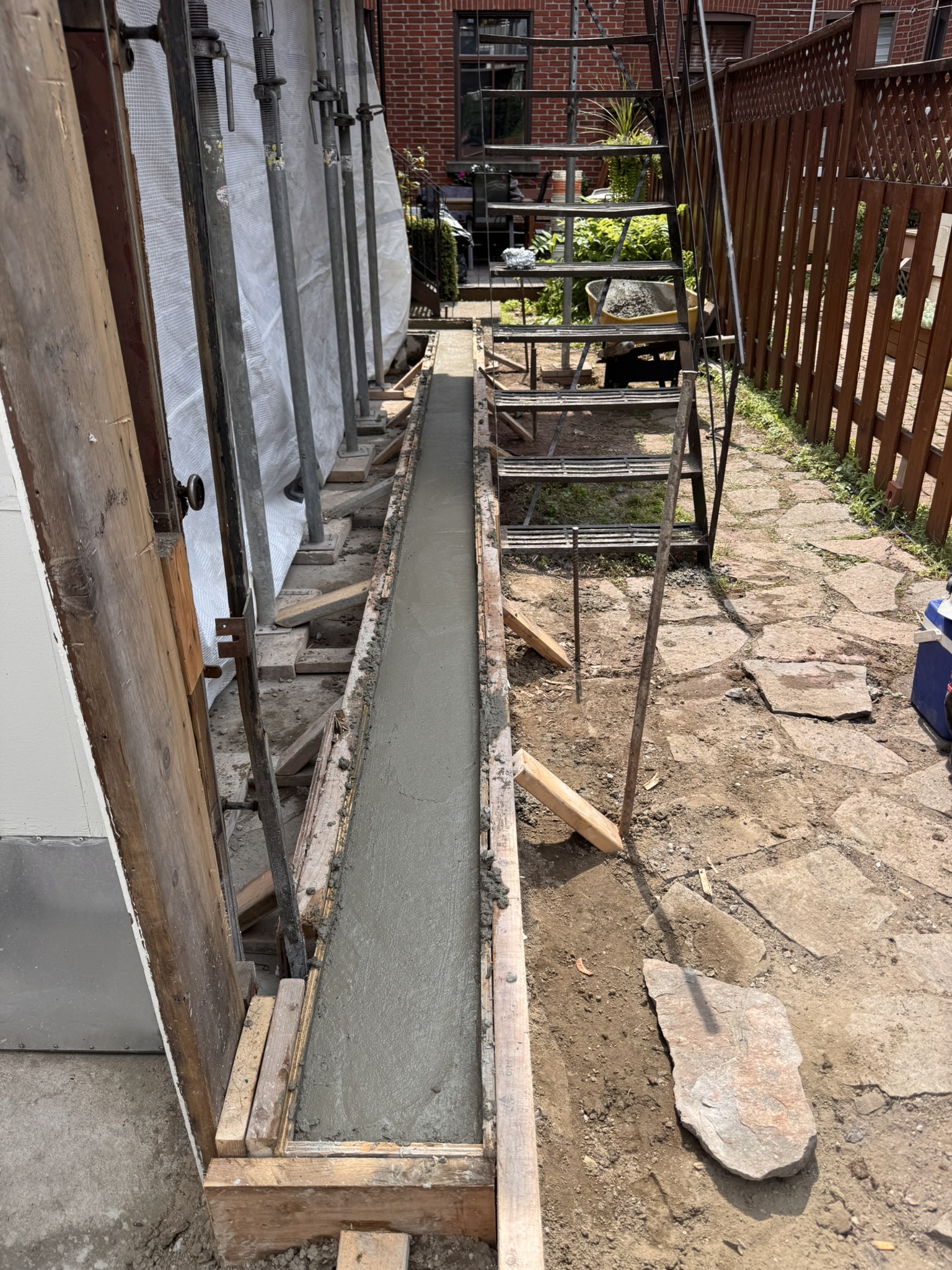 - coulé une nouvelle fondation en béton d’une dimension adaptée au mur de blocs et au parement final.