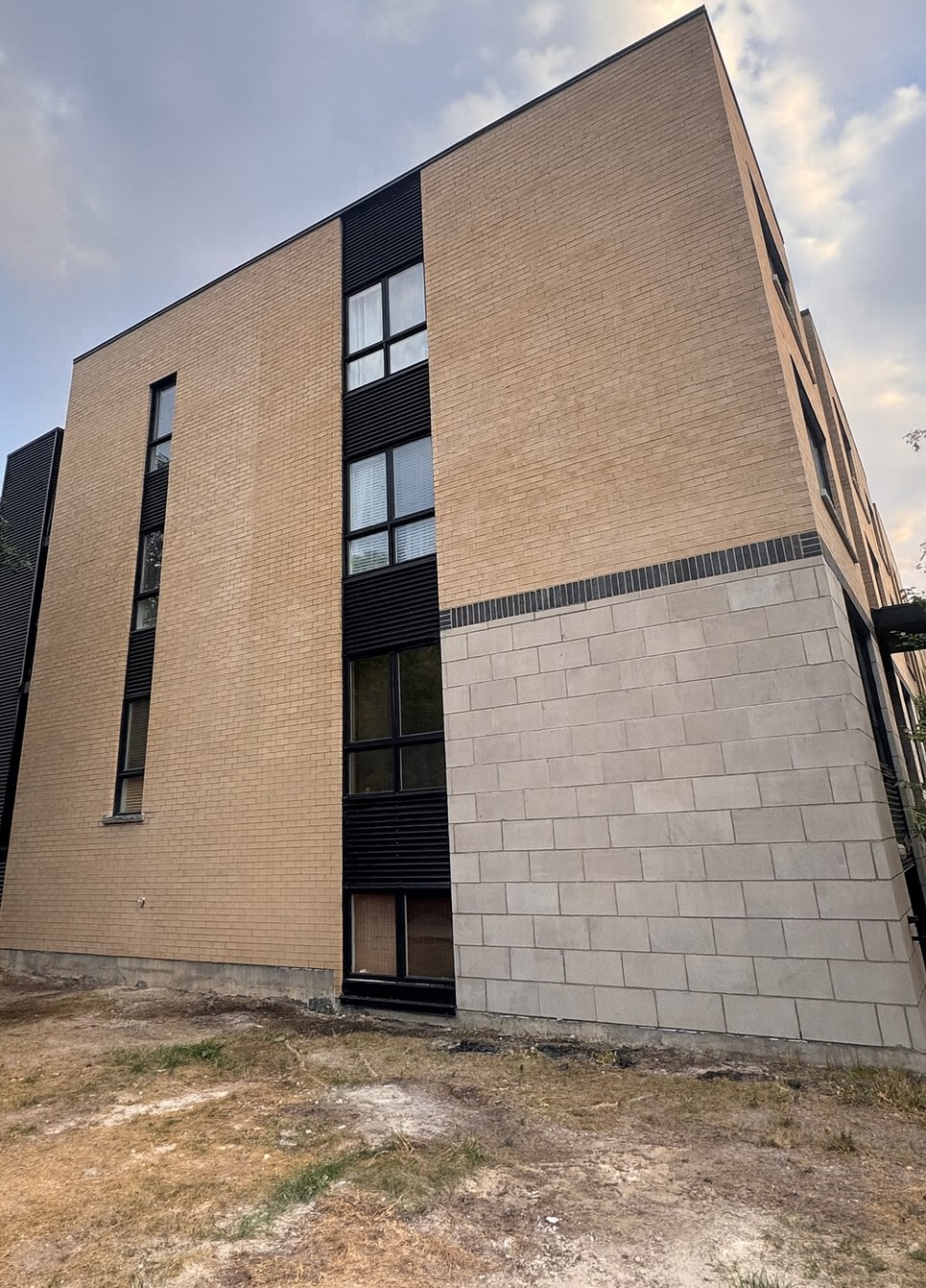 Nous avons procédé au remplacement de sections de brique vieillissantes par une maçonnerie neuve parfaitement intégrée au design d’origine. Une portion du mur a également été reconstruite avec un revêtement de pierre architecturale, créant un contraste moderne et harmonieux avec la brique pâle existante. Les surfaces noires ajourées ont été restaurées ou remplacées afin d’assurer une finition propre et uniforme tout en améliorant la ventilation des sections techniques.
